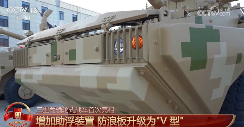 我们现在看到的就是亮相的三型两栖轮式战车,首先来看它们在外观上的变化。与之前相比,最突出的就是在车首部位增加助浮装置,这个装置配备多块浮箱,可以有效提升装备浮力,满足海上安全航行要求。新装备在防浪板方面也进行了改进,将“平板式”升级为“V 型”,有效提升防浪板抗浪强度。