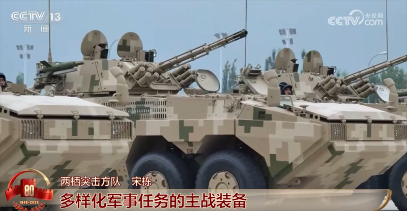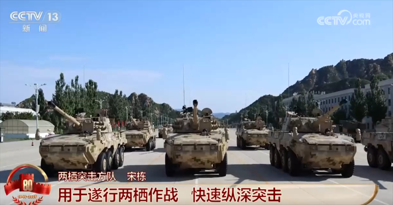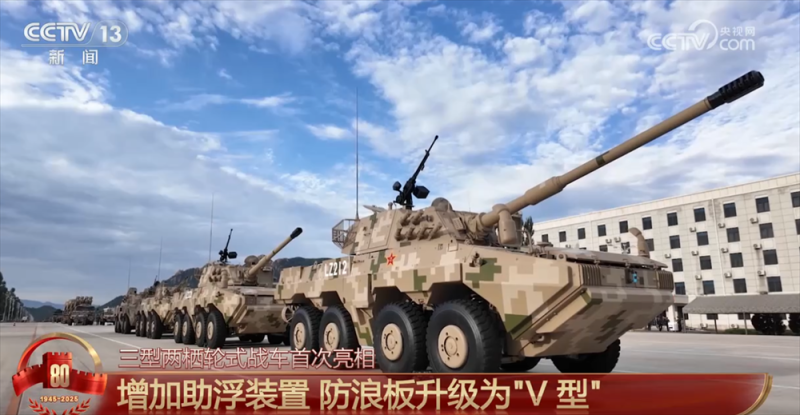 两栖突击方队宋栋称:“本次受阅的三型装备主要包括两栖轮式装甲突击车、两栖轮式步兵战车以及两栖轮式自行榴炮车,它们是遂行两栖登陆作战、纵深快速夺要等多样化军事任务的主战装备。”