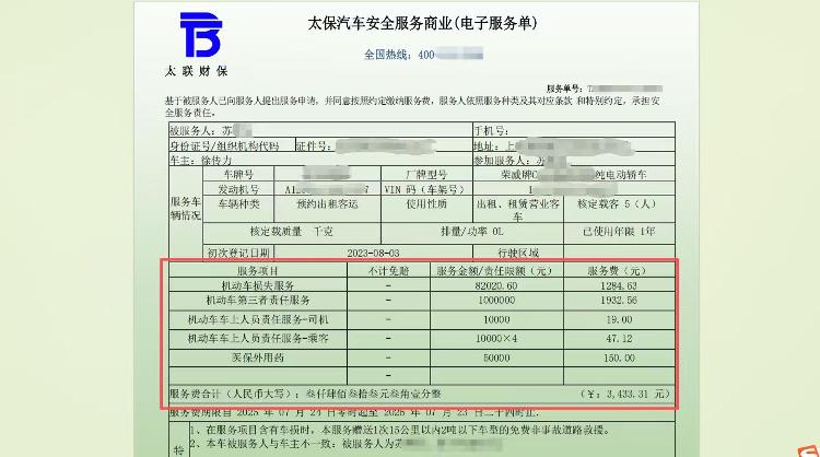 这种便利性成了统筹公司吸引客户的重要手段,但也埋下了巨大隐患。苏同现在已经摸清了规则:“今年买的‘太联财保’,名字跟保险公司相似。电子服务单上写的是‘太保汽车安全服务商业(电子服务单)’,格式和正规保险公司的保单一样,但内容里没有任何‘保险’字眼,写的全是某某服务。我给金融监管部门打过电话,他们说这个不属于保险范畴。”