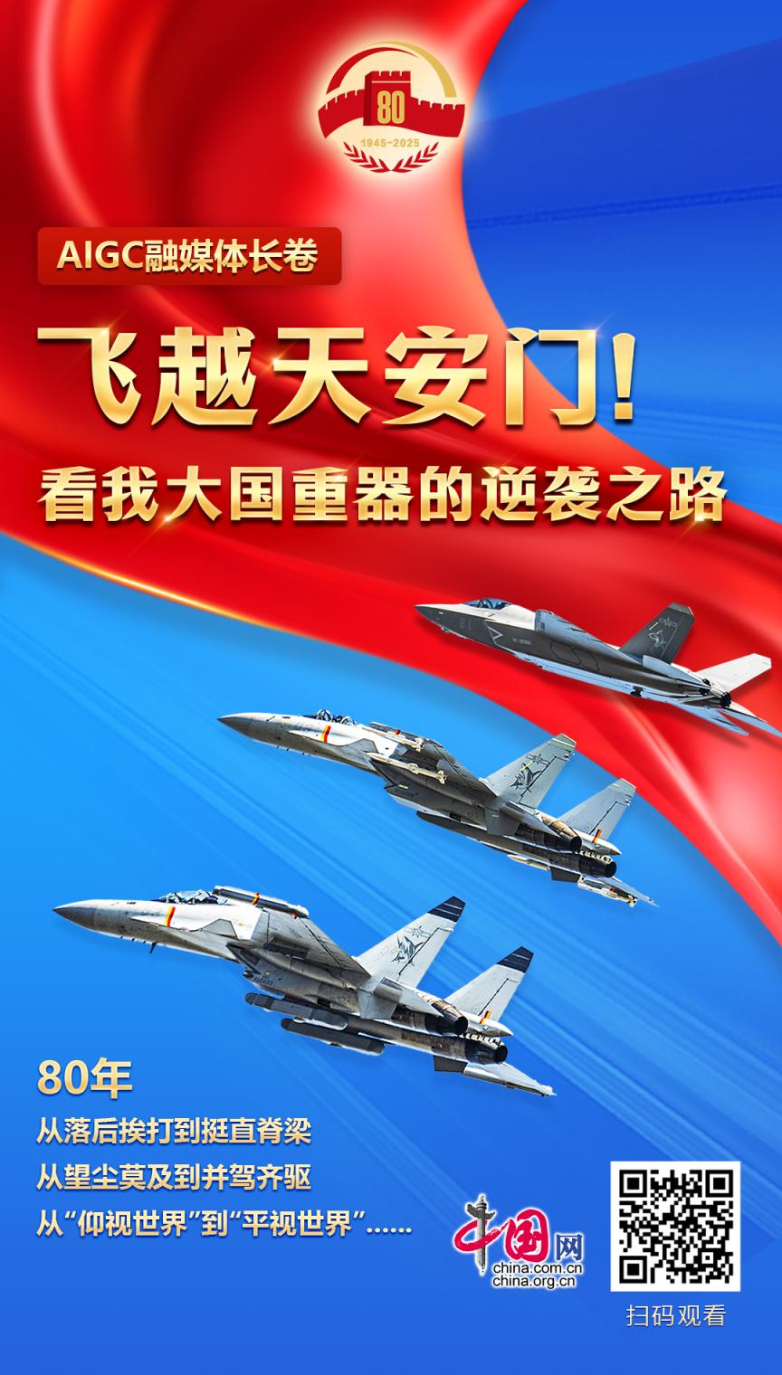 值此中国人民抗日战争暨世界反法西斯战争胜利80周年之际,中国网推出重磅策划《AIGC融媒体长卷 | 飞越天安门!看我大国重器的逆袭之路》,以中国战斗机发展历程为缩影,生动展现80年来,在中国共产党的坚强领导下,中国航空工业从无到有、从弱变强,从“望尘莫及”到“并驾齐驱”,创造世界航空史上的奇迹。