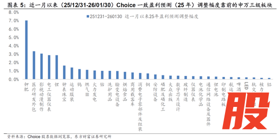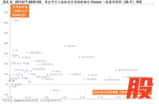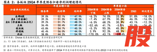 其中,同等披露率条件下,AI硬件(半导体、元件、通信网络设备等)及涨价链(工业金属、能源金属、农化品等)的25Q4净利润预告算术平均增速较25Q3均有进一步提升;而电池、航海装备、汽车零部件及医疗研发外包(CXO)的增速环比25Q3则有一定程度的下滑。