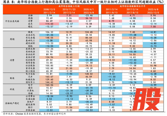 3)过往三轮周期南华综合指数触顶后半年左右时间,指数仍会维持相对高位,但从市场表现看,周期风格相对上证指数的超额收益幅度将明显收窄,金融风格会体现较强韧性,市场整体风格以中低估值为主。