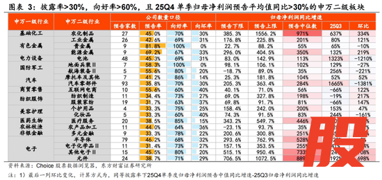申万一级行业中向好率前三的行业为非银金融、钢铁、有色金属,考虑到披露率较低导致的一级行业数据准确度问题,我们进一步从申万二/三级细分领域出发,当前披露率>30%,向好率>60%,且板块25Q4单季度归母净利润预告平均值同比增速>30%的高景气板块仍是主要集中于【涨价链+科技+高端制造】线索::