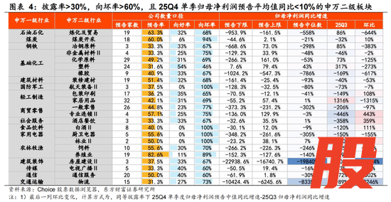 另一方面,申万一级行业中向坏率靠前的行业则为煤炭、石油石化、轻工制造;申万二级细分领域中,当前披露率>30%,向坏率>60%,且板块25Q4单季度归母净利润预告平均值同比增速<10%的板块则主要集中于【黑色金属链、传统消费、地产链】板块: